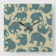 Eine lustige Square Wall Uhr mit Elephant-Silhouetten, gefüllt mit einem dunkelblauen und bordeauxfarbenen Paisley-Muster, auf beigem Hintergrund. Als Teil der Posh & Painterly 'Heffalumps' Kollektion kann dieses Muster an jede Wand-Uhr angepasst werden.