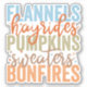 Dieses dynamische und strukturierte Herbstdesign hebt die wesentlichen Elemente der Herbstsaison mit den Worten "Flannels", "Hayrides", "Pumpkins", "Sweaters" und "Bonfire" hervor. Jedes Wort wird in fett gedruckten Großbuchstaben mit einer verwitterten Textur angezeigt, die dem Design ein rustikales, Vintages Gefühl verleiht. Die Farbpalette umfasst coole Blues, warme Orangen, erdige Grüntöne und weiche Braun, die die verschiedenen Farbtöne des Herbstes einfangen. Die Wörter "Hyrides" und "Sweaters" sind in einem fließenden, kursiven Drehbuch geschrieben, das wunderbar mit dem Blocktext kontrastiert und dem Design eine Touch von Eleganz und Bewegung hinzufügt. Kleine Sterne-Akzente sind um den Text verstreut und verleihen dem Text einen zusätzlichen Charme und Spielfreude.