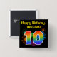 Dieses lustige, lebendige Knopfdesign zeichnet sich durch ein farbenprächtiges, aufstechendes, feierliches Feuerwerk aus, das mit der Zahl "10" inspiriert ist, die ein buntes, von Regenbogen inspiriert Spektrum oder ein Farbverlaufsmuster aufweist. Es enthält auch eine individuelle Name- und Veranstaltungsnachricht, wie zum Beispiel den Geburtstagsgruß "Happy Birthday". Ein solcher Knopf könnte von den Teilnehmern einer Geburtstagsparty getragen werden, die zur Feier des zehnten Geburtstages von jemandem veranstaltet wird. [~Z0000334]