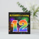 Dieses lustige, lebendige Geburtstagsfeierdesign besticht durch ein farbenfrohes, durch das Bersten von feierlichen Feuerwerken inspiriert Muster, zusammen mit der Zahl "12" mit einem farbenfrohen Regenbogen-inspiriert Spektrum oder Gradientenmuster. Der Name auf der Vorderseite kann angepasst werden. Auf der Rückseite finden Sie anpassbare Informationen über das Party. Geburtstagsfeierlichkeiten wie diese werden vielleicht ausgesandt, um Gäste zu einer Geburtstagsparty einzuladen, die zum zwölften Geburtstag von jemandem gefeiert wird. [~Z0000337]