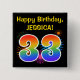 Dieses lustige, lebendige Knopfdesign zeichnet sich durch ein farbenfrohes, durch das Bersten von gefeierten Feuerwerken inspiriert Muster aus, zusammen mit der Zahl "33" mit einem farbigen Regenbogen-inspiriert Spektrum oder Gradientenmuster. Es enthält auch einen anpassbaren Namen und eine Veranstaltungsnachricht, wie zum Beispiel einen Geburtstagsgruß von "Happy Birthday". Ein solcher Knopf könnte von den Teilnehmern einer Geburtstagsparty getragen werden, die zur Feier des dreiunddreißigsten Geburtstages von jemandem gehalten wird. [~Z0000334]