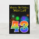 Die Vorderseite dieses lustigen, lebendigen Geburtstagskarten-Designs zeigt ein farbenfrohes, feierliches Feuerwerk mit inspiriertem Muster, zusammen mit der Zahl "43" mit einem bunten, inspirierten Regenbogen-Farbverlauf auf schwarzem Hintergrund. Auf der Vorderseite befindet sich auch eine Geburtstags-Grußbotschaft, die auch einen benutzerdefinierten Empfängernamen enthält. Im Inneren befindet sich eine individuell anpassbare Geburtstags-Grußnachricht, oder vielleicht kann gelöscht und links werden, wenn eine Nachricht von Hand geschrieben werden soll. Eine individuell anpassbare Geburtstagskarte wie diese könnte eine lustige Art sein, jemandes dreiundvierzigsten Geburtstag zu bestätigen. [~Z0000330]