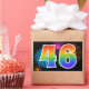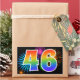 Dieses lustige, lebendige Aufkleber-Design zeichnet sich durch ein farbenfrohes, von feierlichen Feuerwerken inspiriertes Muster aus, zusammen mit der Zahl "46" mit einem bunten, von Regenbogen inspirierten Farbverlaufsmuster auf schwarzem Hintergrund. Aufkleber wie diese können in einem Party zum sechzigsten Geburtstag von jemandem verwendet werden, oder vielleicht zum vierzigsten Hochzeitstag eines Paares, oder zu einem anderen 46. [~Z0000324]