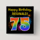 Dieses lustige, lebendige Knopfdesign zeichnet sich durch ein farbenprächtiges, aufstechendes, feierliches Feuerwerk aus, das mit der Zahl "75" inspiriert ist, die ein buntes, von Regenbogen inspiriert Spektrum oder ein Farbverlaufsmuster aufweist. Es enthält auch einen personalisierten Namen und eine Veranstaltungsnachricht, wie zum Beispiel einen Geburtstagsgruß von "Happy Birthday". Ein solcher Knopf könnte von den Gästen bei einer Geburtstagsparty getragen werden, die zur Feier des fünfundsiebzigsten Geburtstages von jemandem veranstaltet wird. [~Z0000334]