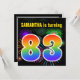 Dieses lustige, lebendige Geburtstagsfeierdesign besticht durch ein farbenprächtiges, aufstechendes, feierliches Feuerwerk, das inspirierte Muster und die Zahl "83" mit einem farbenfrohen Regenbogen-inspirierten Spektrum oder Gradientenmuster. Der Name auf der Vorderseite kann angepasst werden. Auf der Rückseite finden Sie anpassbare Informationen über das Party. Einladungen für Geburtstagsparty wie diese können potenziellen Teilnehmern für eine Geburtstagsparty geschickt werden, die zur Feier des dreiundachtzigsten Geburtstages von jemandem abgehalten wird. [~Z0000337]