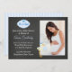 Fun Foto Baby Dusche Einladung auf Chalkboard Hintergrund mit Es ist ein Junge, blaue Streifen, Storch.