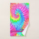 Dieses lustige Badetuch-Set ist in einer gefärbte Krawatte in den Farbtönen Rosa, Grün, Gelb, Blau und Orange gehalten. Jedes Handtuch hat eine rosa Bar auf der Unterseite mit einem Quadrat für Ihren Monogramm-Brief. Ideal für ein Retro- oder Hippy-Design.