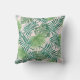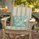 Dieses farbenfrohe Kissen im Freien besticht durch ein Aquarellblau mit tropischen Blätter aus Palmenblättern, die auf einem hellen, rosa Hintergrund gehalten sind.