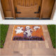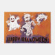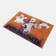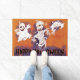 Fun Halloween Outdoor Dekoration für den Monat Oktober. Drei gruselige und geile Halloween-Freunde begrüßen Ihre Gäste an der Tür. Es gibt einen fliegenden, spukhaften Geist, ein Mumie und eine fliegende Fledermaus. Orangefarbene und lila Dekoelemente. Frohe Halloween!