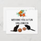 Schicken Sie eine Postkarte, um jemandem ein tolles Halloween zu wünschen. Zwei schwarze Kätzchen und zwei orangefarbene Kürbisse sind unten zu sehen. An der Spitze ist ein Cluster von Marigold-Blume. In einem spukhaften Text in der Mitte ist die Nachricht: "Ich wünsche dir viel Spaß zu Halloween." Sie können den Text auf Wunsch in Ihre eigene Nachricht ändern.