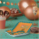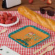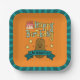 Adorable lustige Geburtstagspapier-Teller, um Ihr Party zu erhellen. Über einem orangen Hintergrund beginnt das Design von oben mit Happy Birthday in grün und gelb Text mit einem Kuchen mit rosa Eis und drei beleuchteten Kerzen neben dem H in glücklich. Unterhalb des Textes befindet sich eine niedliche lustige, fröhliche braune Kartoffel mit Armen und einem großen Lächeln. Auf der anderen Seite der Kartoffel ist ein blauer Banner mit einer Vorlage, um Ihren Namen zu personalisieren. Schließlich sind drei gelbe Sterne um die Kartoffel gepunktet.