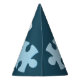 The Fun Jigsaw Puzzle Kids' 5th Birthday Blue Party Hat features blue jigsaw puzzle pieces. There is a placeholder in the center for the birthday boy or girl's age. All elements are customizable by color.