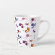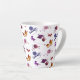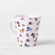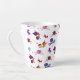 White latte mug with all around pattern of knitting needles, balls of yarn and cats pulling yarn. Gradient colors are maroon, blue, pink and golden brown. Choose either the small or tall latte mugs.