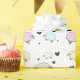 Dieses Packpapier zeigt Herzen mit niedlichen kleinen Schafen mit gelber, grauer, rosa, blauer und grüner Wolle.