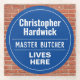 Gedenkliches Wandgeschenk in Form eines Untersetzer aus Glas für einen Metzger. Blaue und weiße Plakette. Bearbeiten Sie das Design, um die Formulierung so zu ändern, dass der Empfänger des Geschenks Anzug erhält.
