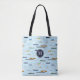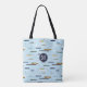 Diese einzigartige mit Monogramm Totttasche mit einem Motiv, die auf hellblauem Untergrund eine abwechslungsreiche Schiffsgröße aufweist - das Muster umfasst 2 Frachtschiffe, 2 Segelschiffe, 2 antike Holzboote, 1 Fischerboot, ein Ruderboot und ein Hausboot - die nahe Betrachtung des Musters zeigt, dass die Menschen einen Tag am Fluss genießen - "A Day On the River" © katz_d_zynes 20202202200000