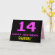 The front of this fun, nerdy, and geeky birthday greeting card design feature a large pink number "14", along with the message "HAPPY BIRTHDAY" in pink and a bold yellow customizable recipient name. The text has a look inspirred by that of retro 8-bit style computer game and video game graphics from the 1970s and 1980s and the background is colored black. The inside has a personalized birthday greeting message, or could perhaps be cleared and left blank if a message is to be written by hand instead. Trassia personalized birthday card like this might be a fun way to celebrate somebody's fourteenth birthday. [~ Z0000478]
