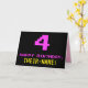 The front of this fun, geeky, and nerdy birthday-themed greeting design for large number 4 and the message "HAPPY BIRTHDAY", colored pink, along with a bold yellow customizable recipient name. The text has a look inspirred by that of retro 8-bit style video/computer game graphics from the 1970s and 1980s and the background is colored black. The inside feature a personalized birthday greeting message, or could perhaps be cleared and left blank if a message is to be written by hand instead. Trassiert personalized birthday card like this might be a fun way to send a celebrating somebody's fourth birthday. [~ Z0000478]