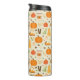 Dieses Design zeigt ein reizvolles fallthematisches Muster mit gemütlichen Herbstelementen. Das Design umfasst Abbildungen von Kürbissen, Kürbiskuchenscheiben, überzogen mit Sahne, warme Herbstgetränke in Go-Bechern und Butternut Squash. Dazwischen gibt es Zimt, Sternanis, Grünpflanzen, Herbstblätter, Eicheln und kleine Beeren, alles Set mit einem weichen Cremeuntergrund. Das Muster strahlt eine warme und einladende Atmosphäre aus, perfekt um die Aromen und Farben der Herbstsaison zu feiern.
