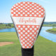 This pretty ladies personalized golf head cover features white polka dots on an orange background with a customizable name. You can edit the message to say something else if you'd like to change the message or add a last name. It's a stylish, cute gift for a golfer. It's a useful present for your mom, sister, grandma, or any lady whose hobby is playing golf. Women monogram golf towels.