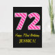 Die Vorderseite dieser einfachen und lustigen Geburtstagskarte mit einer großen Zahl "72", mit einem hellrosa und dunkelrosa Streifen Muster. Es enthält auch die Meldung "Happy 72. Geburtstag", und einen benutzerdefinierbaren Namen. Der Hintergrund der Vorderseite ist schwarz. Im Inneren befindet sich eine personalisierte Geburtstagsgrüßbotschaft, oder man könnte sie löschen und leer verlassen werden, wenn eine Nachricht von Hand geschrieben werden soll. Eine solche Geburtstagskarte könnte eine lustige Art sein, Geburtstagswünsche an jemanden zu senden, der seinen siebzigsten zweiten Geburtstag feiert. [~Z0000377]