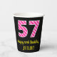 Dieses fröhliche, zum Geburtstag bestimmte Quadrat-Aufkleber-Design mit einer großen Zahl "57" mit einem dunkelrosa und hellrosa Streifen Muster, zusammen mit der Meldung "Happy 57 th Birthday", sowie einem anpassbaren Namen. Der Hintergrund ist schwarz. Geburtstagsthematische Papiertassen wie diese könnten eine lustige Art sein, jemandes siebenundfünfzigsten Geburtstag zu feiern. [~Z0000580]