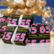 Dieses lustige Geburtstags-Thema Verpackungspapier Design hat eine große Zahl "65", mit einem hellrosa und dunkelrosa Streifen Muster. Es enthält auch die Meldung "Happy 65. Geburtstag", und einen individuelle Name. Der Hintergrund ist schwarz. Geburtstagsthematik-Verpackungspapier wie dieses kann bei Geschenken oder Geschenken zum 65. Geburtstag eines Menschen verwendet werden. [~Z0000376]