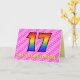 This festive and cheerful 17th birthday greeting card design has a front featuring a large number "17" having a colorful pattern inspirred by the appearance of a rainbow spectrum, wir haben light pink and dark pink heart shapes striped pattern background. The front also feature the message "Happy 17th Birthday", followed by an editable recipient name. The inside feature a personalized birthday greeting message, or could perhaps be cleared and left blank if a message is to be written by hand instead. A customizable birthday card like this might be a fun and happy way of sending birthday wishes to somebody who is celebrating their seventeenth birthday. [~ Z0000418]