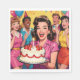 Fun birthday party paper napkins with a group of retro mid-century friends celebrating! These are in pink, yellow, red and blue. The front woman is holding a vintage birthday cake.