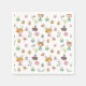 Niedliche Papierservietten mit einem Muster aus Osterelementen. Es gibt Kinder mit sonnigen Ohren, Küken, Kaninchen und Ostereiern. Illustriert und entworfen von Patricia Alvarez.