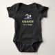 Ein lustiger Babybodyanzug für Schwimmer. Das Bild ist ein Piktogramm eines Schwimmers in weiß und blau. Der weiße und goldfarbene Text "COACH I'm charge!" kann durch einen Namen oder eine eigene Beschriftung personalisiert werden.