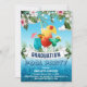 Fun Summer Abschluss Pool Party Einladung, mit aquablauem Wasser, sonnigen Himmel, botanischer tropischer Vegetation mit exotischen Blume, Saitenleuchten, mouthwässriger Aquarellcocktails und einer 2023 Graduiertenschablone, die leicht personalisiert werden kann.