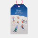 Farbenfroh und festlich. Dieses Geschenkschild zeigt Skifahrer in mehrfarbigen Geräten, die schneebedeckte Pisten für den Urlaub abgleiten. Das Set zeitgenössischer Schriftart verbindet Moderne mit Alt-Schule und schafft einen festlichen und fröhlichen Rahmen. Personalisieren Sie den Rücken, um es zu Ihrem eigenen zu machen.