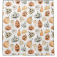 Dieses Design zeichnet sich durch ein reizvolles Wasserfarbenmuster aus Kürbissen und Jack-o'-Laternen in einer sanften, gedämpften Farbpalette aus. Das Design umfasst verschiedene Kürbisformen und -größen, die in sanften Orange-, Creme- und Grautönen gestrichen sind. Jeder Jack-o'-Laterne hat ein einzigartiges, gemeißeltes Gesicht, das von fröhlich und freundlich bis leicht spöttisch reicht und dem Muster Charakter und Abwechslung verleiht. Die Kürbis sind auf einem sauberen, weißen Hintergrund angeordnet, wodurch sich die zarten Aquarelltexturen herausstellen können. Das Gesamtdesign ist festlich und ansprechend, ideal, um den skurrilen Geist von Halloween auf gemütliche, künstlerische Weise zu erfassen.