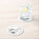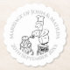 Untersetzer für eine Hochzeitsfeier oder einen Empfang im Freien. Enthält einen lustigen Cartoon Ich illustriere eine gigantische Hochzeitskuchen, die von einem Koch, der ein Stepladder ist, vereist wird, und Formulierung, die die Namen der Braut und Bräutigam sowie das Datum der Hochzeit enthält.