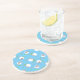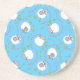 Ein schicker, runder Sandstein-Untersetzer mit einem Comic-Schaf-Muster und "Cymru am Byth" in Rot, auf einem türkisfarbenen, blauen Hintergrund, den man nach Belieben ändern kann.