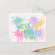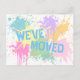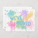 Eine farbenfrohe und skurrile Spritzlackierung "wir haben verschoben" Postkarte, um Freunde & Familie in hübschen Pastelln zu schicken! Anpassbarer Hintergrundtext für Adressinformationen