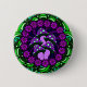 Ein Knopf mit fünf lila Pilzen gegen einen Schwarz-, dunkelblauen und Lilastrudelhintergrund. Der Entwurf ist Kreis und hat hellere lila Blumenmotive, die Pilze zu umgeben. Hinter dem lila Entwurf sind verzierte grüne Motive.