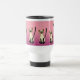 Liebhaber der siamesischen Katze genießen diese rosa Reise-Tasse. Fünf Bilder der siamesischen Katze des Cartoon, jedes, das kleiner als das folgend ist, werden ausgerichtet. Das kleinste man ist Sprichwort, "Meow" in einem mutigen schwarzen Schriftart. Alle sind auf einem rötlich-rosa Hintergrund mit einer Pinkgrenze.