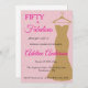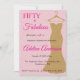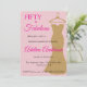 Fünfzig und Fantastisch Skript minimal rosa, gold und schwarz moderne 50. Geburtstagseinladung, die Sie personalisieren und für Ihre fünfzigste Geburtstagsfeier versenden können. Die Wörter "Fünfzig und Fantastisch" sind auf einem rosa Hintergrund gesetzt, mit beliebter Hot-Pink-Skript-Font-Typografie, neben einem eleganten, anspruchsvollen goldenen trägerlosen Abendkleid.