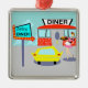 Dienen Sie oben etwas, das mit dieser Fünfzigerjahre Tischgast-Weihnachtsverzierung speziell ist. Der Cartoon, der Ausrüstungsbeschreibungen ein Gebäude des roten Ziegelsteines mit blauen Fenstern, grauen doppelten Türen und einem weißen Zeichen zeichnet, das sagt, "Restaurant" hockte auf dem Dach. Im Parkplatz ist ein zweites Zeichen auf einem Pfosten. Das Zeichen hat einen Türkishintergrund und einen blinkenden roten Pfeil, welche zeigen die Weise auf, "Dons Restaurant." Das Zeichen hat seine Arbeit erledigt, weil es ein helles gelbes Auto mit den Flossen gibt, die nahe bei ihm geparkt werden. Obwohl wir sie nicht sehen können, müssen die Passagiere des Autos ihre Lippen klatschen. Ein niedlicher, junger Carhop ist Rollerskating ihre Weise zum Auto. Ihr brünettes Haar ist in einem bouncy Pferdeschwanz. Sie trägt eine kurze, rosa Uniform mit schwarzer Ordnung und eine weiße Schürze. Ausgeglichen einerseits, trägt der Carhop einen schwarzen Behälter, der einen riesigen Hamburger und eine Auffrischung, altmodische, Glasflasche Soda hält. Der Hintergrund hinter dem Restaurant ist mit hellblauen Wolken und den Silhouetten der Zedernbäume aquamarin.
