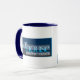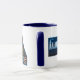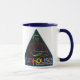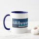 Die 15 Unze funhouse Tasse ist mehr als ein mouthfull. Aufmachung des ursprünglichen Logos und des neuen Logos auf einer weißen Tasse mit blauer Kante und Griff.