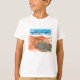 Ein lustiger und farbenfroher Aquarellstift und eine Tinte, die von einer Meeresschildkröte am Strand zeichne (und verpassen Sie nicht den Junggesellen beim Surfen!), schmückt den T - Shirt dieses gemütlichen Jungen.