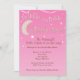 Niedliche Babyduscheneinladung mit einem Twinkle, funkeln wenig Sternthema. Weicher rosa Himmel mit spielerischen Weißsternen und einem weichen sichelförmigen Sahnemond. Twisty weißes Band verziert die Spitze. Einfach, für Ihr eigenes Funkeln-Funkeln-Sternthema zu redigieren.