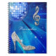 Elegantes, bezauberndes personalisiertes Notizbuch. Schönes, blenden, trendy Druckbild mit den silbernen Glitzerndiamanten, die musikalische Anmerkung der Juwelen bling sind, funky blauer retro Discospiegelball und hohe Ferse des Silberstiletts arbeiten Schuh auf einem Chic Blau-Druckbildhintergrund um. Ein niedliches, nobles, modernes, stilvolles, hübsches Geschenk für sie oder irgendein Musikliebhaber. Frauen und Jugendmädchen sind Liebe dieses coole, Spaß, funky, girly Entwurf gewillt.