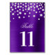 Elegante Hochzeitsstipps mit extravaganter Skriptkalligraphie gepaart mit einem modernen Schriftart mit all caps. Das Bild im Hintergrund zeigt Imitate lila Indigo-Omelfolie und silberweiße Kristall-Konfetti-Diamanten an der Spitze. Jeder Funken oder Glanz ist eine digitale Schöpfung. Der Text der Tischnummer wird auf Vorder- und Rückseite dupliziert, aber Sie können eine Seite anpassen, wenn Sie eine Liste von Gastnamen bevorzugen.