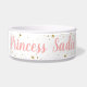Rosa und goldene Imitate Glitzer Prinzessin Kronen Haustier personalisiertes Essen oder Wasser bietet einen Platz, um Ihre Katze oder Hund Namen mit einem "Prinzessin" Titel und Imitate funkeln goldenen Krontiaras auf der Seite mit einem konfetti Sternexplosion Hintergrund.