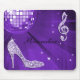 Elegantes, bezauberndes personalisiertes Mousepad. Das schöne, blenden, trendy Druckbild, das lila sind, die lila Lavendel-Glitzerndiamanten, die musikalische Anmerkung der Juwelen bling sind, der funky retro Discospiegelball und die hohe Ferse des Stiletts arbeiten Schuh auf einem lila Chic, Flieder-/Lavendeldruckbildhintergrund um. Ein niedliches, nobles, modernes, stilvolles, hübsches Geschenk für sie oder irgendein Musikliebhaber. Frauen und Jugendmädchen sind Liebe dieses coole, Spaß, funky, girly Entwurf gewillt.