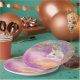 Hier sind lustige Geburtstagspapiere Teller, die jeder, der Lieben einicorns lieben wird! Es verfügt über ein hübsches, weißes Einhorn, das sich auf goldgelben Orangen- und Lavendelwolken ruht, mit einem bunten, wirbelfarbenen Universum als Hintergrund. Vor allem ist ein Overlay von Gold- und Silberstars. Ihr benutzerdefinierter Text besteht aus zwei gekrümmten Textfeldern oben und unten.