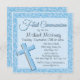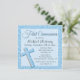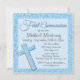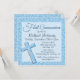 Erste Kommunionseinladung hübschen blauen Imitat Sequin. Kennzeichnet ein hübsches funkelndes Kreuz gegen einen hellblauen und weißen Striahintergrund. Hand gezeichnete Illustration durch McBooboo. Treten Sie mit mir bitte mit allen möglichen Farbänderungen oder -problemen in Verbindung, die Sie haben konnten.